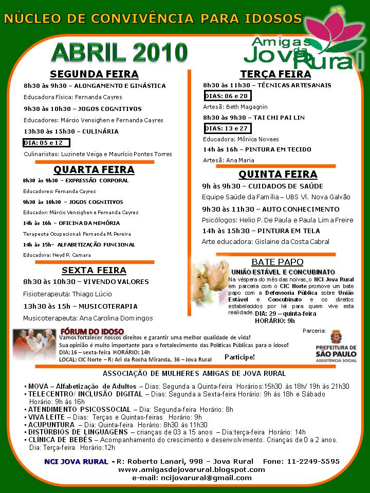 No dia 19 de março de 2010, os idosos de diferentes regiões de São Paulo se reuniram pela segunda vez, para eleger o presidente do Grande Conselho Municipal do Idoso, vaga disputada pelos conselheiros que somaram a maior quantidade de votos em cada uma das cinco regiões metropolitana da cidade. Com uma série de acusações de ilegalidades a primeira eleição aconteceu no dia 15 de dezembro e foi anulada no mês de fevereiro de 2010, sendo instituída uma nova data para a votação. Os idosos do NCI Jova Rural compareceram neste evento cumprindo com seus deveres de cidadãos e conscientes da relevância da participação para o fortalecimento do segmento neste órgão de representação da administração pública.